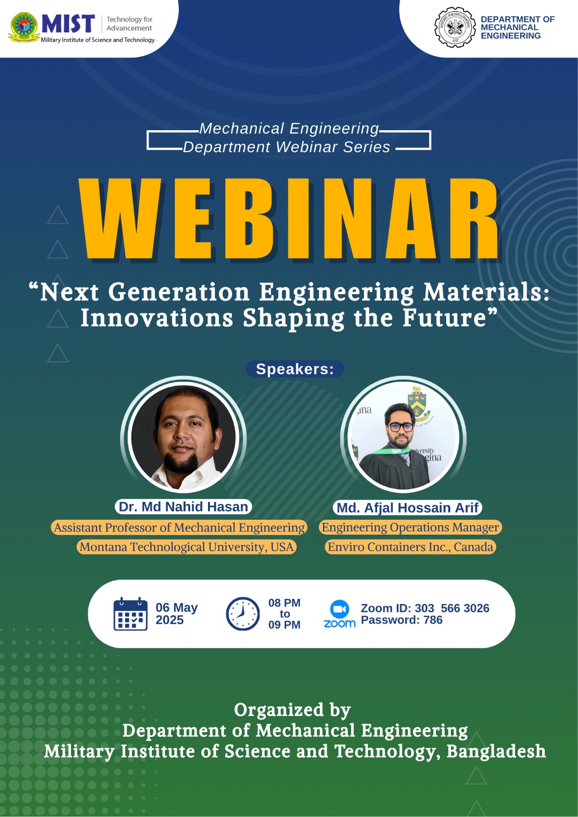 The session featured Dr. Md Nahid Hasan, Assistant Professor of Mechanical Engineering at Montana Technological University (USA), and Md. Afjal Hossain Arif, Engineering Operations Manager at Enviro Containers Inc. (Canada). The webinar focused on advancements in modern engineering materials and the innovations shaping emerging technologies.